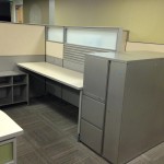 8′ x 8′ x 57’H. Frosted Glass. Paper Flow Management. Shelving. Credenza. Case Style Work Surface.