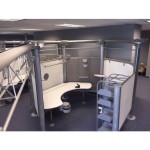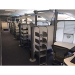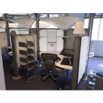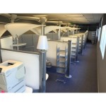 Stunning Herman Miller Resolve Stations (82″W x 72″D). These stations are fully appointed with (2) Shelves, (1) Adjustable Lamp, (1) 4-Shelf Tower, (1) Hanging file bar, 2- Duplexes power outlets, Rotating storage trays, Bubble noise abatement screens, Boomerang Table (82″W x 25″D), Canopy, Metal screen garbage can and Florescent Vertical lamp bar at ‘end of runs.