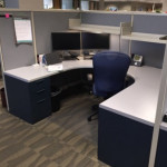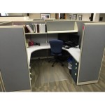 Steelcase Avenir (6 x 6)’s … or (6 x 8)’s – the cubicles are all 65″ tall and have (2) Shelves, (2) BBF Pedestals, and wing panel for privacy. These are very nice cubicles and present an ultra value-oriented furniture buy. These cookie cutter cubes have a Nice steel blue print fabric with cool soft-white trim.